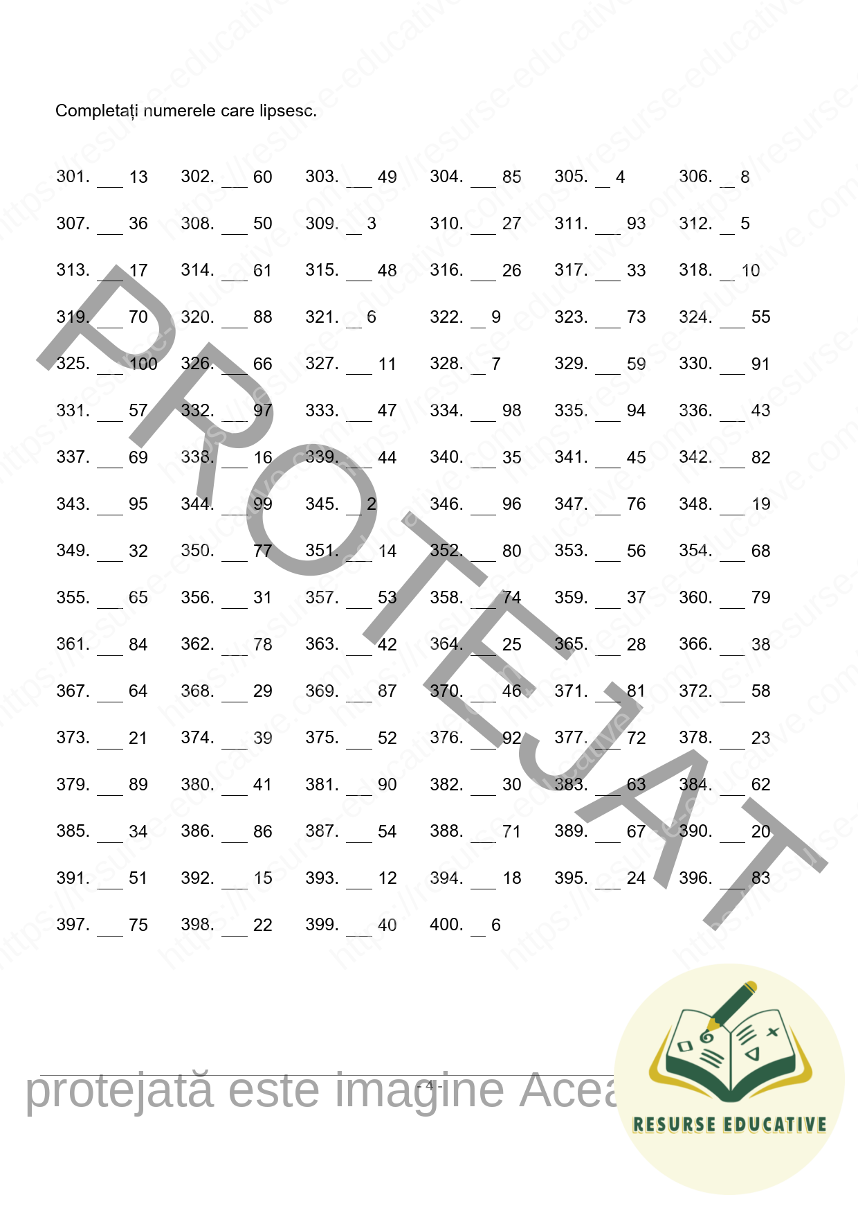 ✔️ 100 de pagini cu peste 9500 de exerciții de completare a numerelor lipsă
