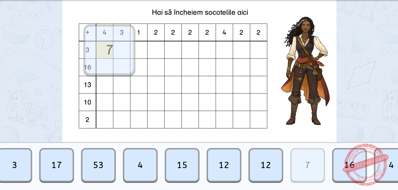 Copiii adună numerele din tabel și plasează rezultatele corecte în căsuțele potrivite, primind feedback imediat. Exercițiul contribuie la consolidarea calculului matematic, a atenției și a gândirii logice.