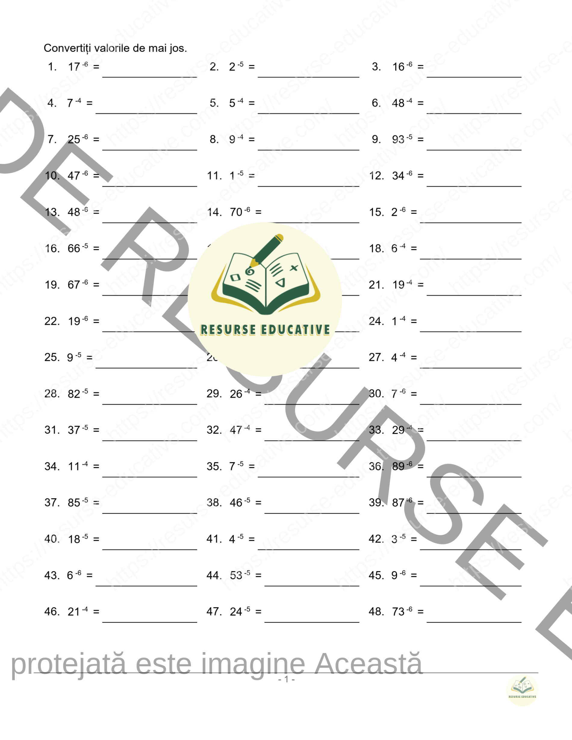 Fișe PDF PREMIUM pentru exersarea puterilor cu exponenți negativi, cu exerciții clare și răspunsuri pentru verificare rapidă.