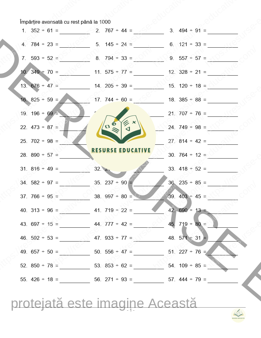 Fișă de Împărțire Avansată cu Rest până la 1000 (57 Exerciții) - GRATUITĂ, PDF cu Răspunsuri Incluse!